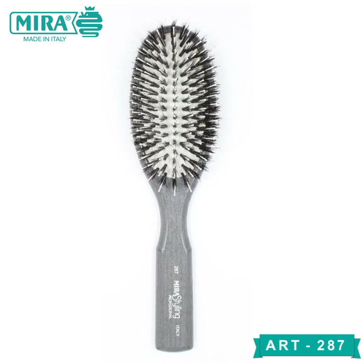 The Mira Styling Brush Art 287, made in Italy, is a professional-quality brush designed for smooth styling and added volume. Featuring heat-resistant nylon bristles and a lightweight ergonomic handle, it ensures effortless grip and control. Perfect for blow-drying, straightening, or curling, it leaves hair shiny, frizz-free, and beautifully styled.